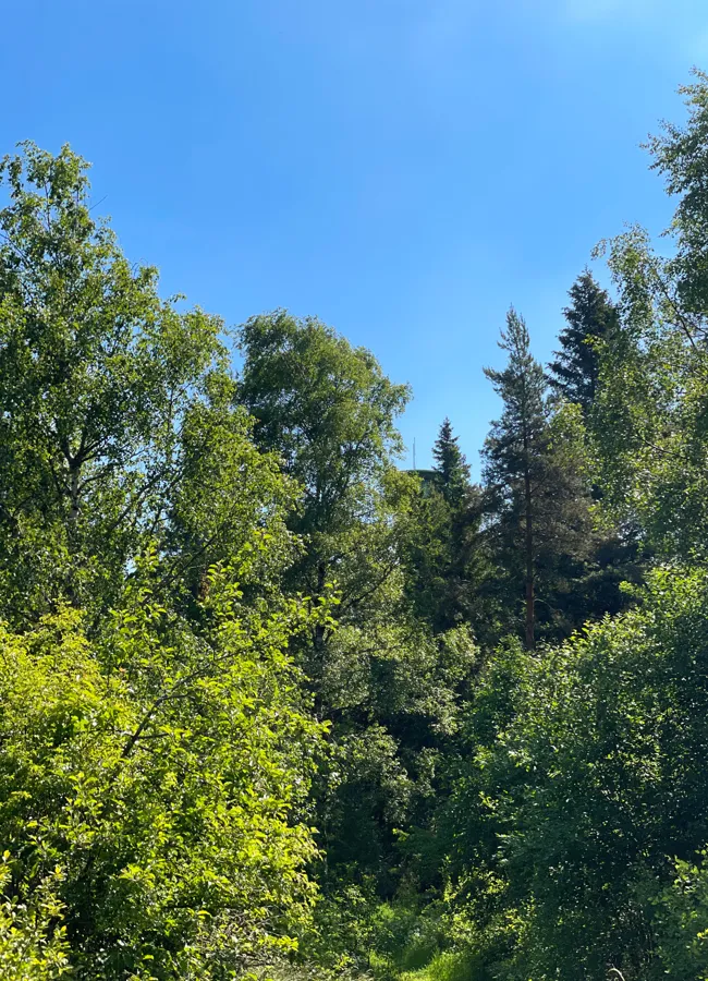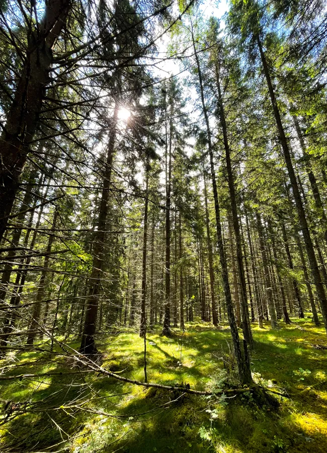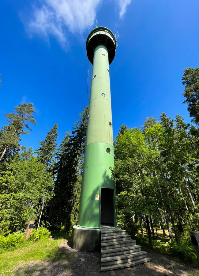 Vandringen går genom granskog och det är en mäktig känsla att plötsligt se tornet sticka upp över grantopparna.