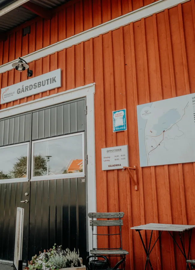 I gårdsbutiken säljs inte bara den egenodlade frukterna utan även andra lokala produkter så som potatis, ägg, honung, kallpressad rapsolja från Drättinge gård och nyrostat kaffe. Här finns gelé, must och cider som är tillverkade av gårdens äpplen. Gården producerar även alkoholhaltiga drycker som säljs på Systembolaget i närområdet. Butiken är öppen onsdagar och lördagar. På gården hittar du även ett Kafferosteri, som är ett bra stopp när du cyklar Landsjön runt.